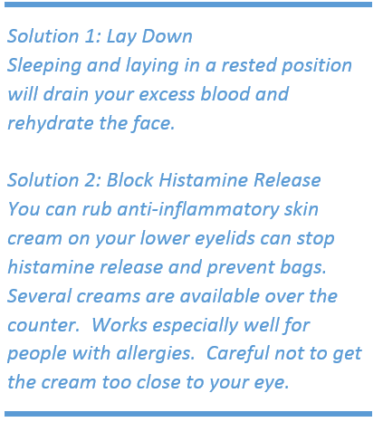 You have huge numbers of Mast Cells in the skin under the eyes. These Mast Cells will release histamine (sometimes by themselves, and sometimes when you rub them), which will cause swelling under the eyes—and darkness. You can rub over-the-counter anti-histamine skin cream on your lower eyelids to stop histamine release and prevent bags.