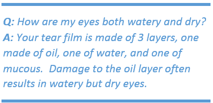 Dry Eye Syndrome (aka Keratoconjunctivitis sicca) is a condition in which there are insufficient tears to lubricate and nourish the eye. Tears are necessary for maintaining the health of the front surface of the eye and for providing clear vision. People with dry eyes either do not produce enough tears or have a poor quality of tears. Dry eye is a common and often chronic problem. Your symptoms of Dry Eye may include: dryness, scratchiness, burning, and redness, a sensation that sand is in your eye or blurred vision. At our office, we execute over 10 methods of improving our patients dry eyes. During your examination we will determine which methods are best for you.