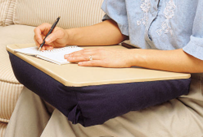 31. BEAN BAG LAP TABLE Ergonomics. This device is not for everyone because it creates a reading and writing surface on your lap. It can be helpful, but keep in mind that you may need to hold your reading material closer than your lap if you have high-strength reading glasses. Do not eat or place drinks on a bean bag lap table.