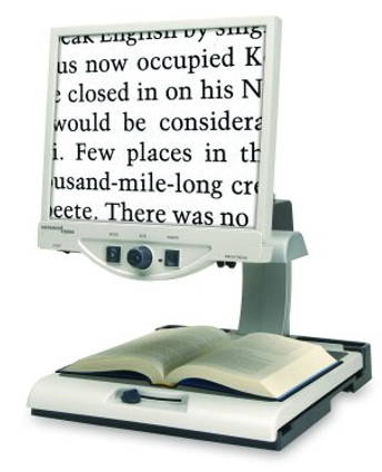 13. CC-TV ELECTRONIC HOME MAGNIFIER For long-term at-home reading. There are a number of these devices, and most of them are incredibly easy to use, making them appropriate for any age. Simply place an item on the table and view a 2-30x magnified image of it on the screen above. These machines are very large and can be expensive, with price ranges from $2,000-$3,000. Add-Ons: Some CCTV's have unique abilities such as portability, white text on a black background, text color changes, and 'OCR' technology that reads text out loud for you.
