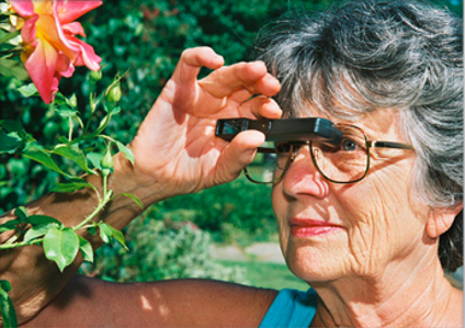 20. MOUNTED FLIPPING TELESCOPE For distance/walking. There are many mounted flipping telescopes, but my favorite is the Ocutech Sight Scope. This device is mounted on your glasses at the top of the frame. They have a hinge, allowing you to flip them away from your central vision when not in use. That way, you can walk around while they are on. When you are ready to sit and use the telescope portion to view events at a distance, simply flip the telescope down. Comes in several distance magnifications, from 1.5X to 4X. Costs vary but tend to be very expensive.