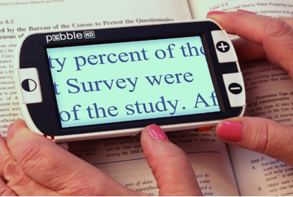 7. ELECTRONIC STAND & HAND MAGNIFIER (DISCREET) For short and long-term reading. The Pebble is a versatile and discreet electronic portable magnifier. It can be placed directly against a page to act as a stand magnifier, or you can twist out the handle and use it as a hand magnifier. Yet its appearance is discreet enough it will go unnoticed by people around you. This is an electronic device and is made to be easy to operate, but some older patients may have difficulties. Price ranges from $400-$700.