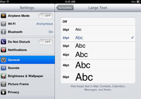 39. PHONE AND TABLET ACCESSIBILITY TRAINING Most phones and tablets can have the font increased in size across the entire device, from app names to text messages. Ask your optometrist, occupational therapist, or the customer support of the company that makes your device to get help.