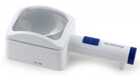 11. HAND MAGNIFIER For short-term reading. Unlike the stand magnifier, a hand magnifier must be held up at all times between the patient and the object being viewed. It is not pressed against the patient's eyes like glasses, nor is it pressed against the paper like a stand magnifier. This makes hand magnifiers excellent for short periods at a time, quickly looking at ingredients lists at a grocery store or directions on a pill bottle. Hand magnifiers are not for reading books. Comes in 2X-10X range. Cost varies greatly by quality and self-lighting, from $20 to $300. Spending the extra money on a higher quality magnifier is worth it, if financially viable.